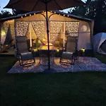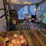 Die 1-Zimmer- Hotel Caravan Met Voortent En Bijzettentje verfügt über eine Terrasse mit Aussicht auf den Garten sowie einen Swimmingpool.